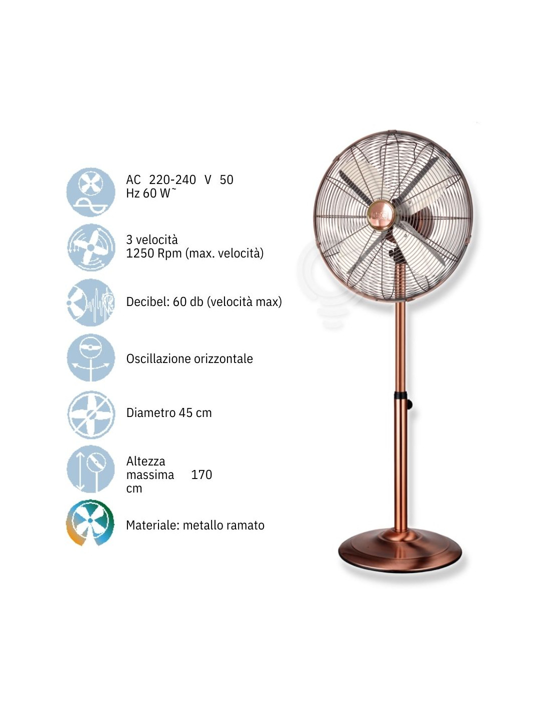 Mit einer Spannung von 220–240 V Wechselstrom und einer Frequenz von 50 Hz sind Leistung und Energieeffizienz gewährleistet und sorgen für ein optimales Erfrischungserlebnis. Mit einer Leistung von 60 W liefert dieser Ventilator einen kräftigen und erfrischenden Luftstrom. Seine maximale Drehzahl von 1250 U/min sorgt für eine schnelle und gleichmäßige Luftzirkulation im gesamten Raum, während die horizontale Oszillation eine noch breitere Verteilung der Frischluft ermöglicht.