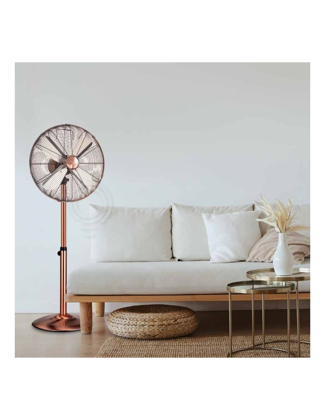 Warte nicht! Holen Sie sich noch heute unseren Bodenventilator aus kupferfarbenem Metall nach Hause und freuen Sie sich auf einen kühlen, komfortablen und stilvollen Sommer. Frische ist zum Greifen nah!