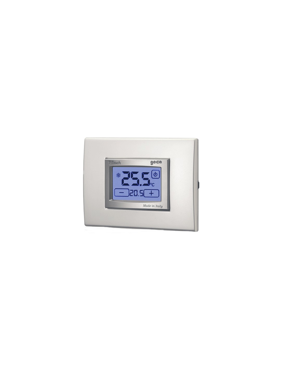 alimenté par des batteries, il a le double mode de fonctionnement été et hiver pour contrôler les systèmes de climatisation et de chauffage. il suffit de toucher la surface de l'écran pour activer le rétro-éclairage et afficher les icônes de contrôle qui permettent, en plus de contrôler la température, de faire varier le différentiel thermique et d'activer la fonction de verrouillage des paramètres. t-touch dispose d'un programme "antigel" qui préserve le système même lorsque le thermostat est éteint.