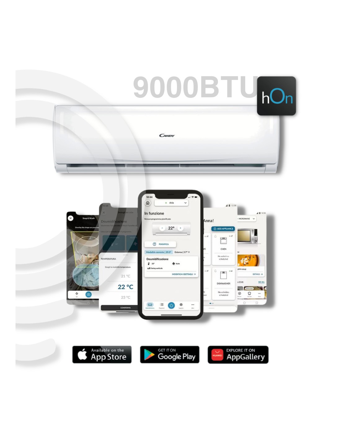 Le contrôle Wi-Fi peut être effectué via l'application Candy Simply-Fi, qui est disponible gratuitement sur Google Play Store et Apple App Store. L'application vous permet d'allumer et d'éteindre le climatiseur, de régler la température, de régler la minuterie et de vérifier l'état du filtre à poussière.